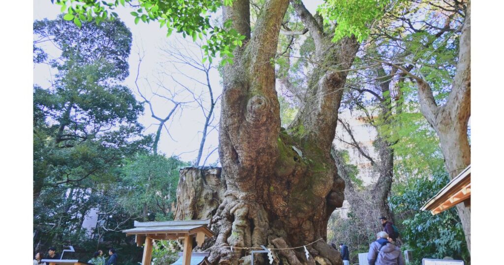 本殿隣の竹林ルートを歩いていくと、樹齢2000年の大楠が姿を現します。周囲を一周まわると寿命が一年延びるという言い伝えがあり、多くの参拝者が静かに祈りを込めながら歩いていました。木の根元に立つと、自然と背筋が伸びるような神聖な空気に包まれます。